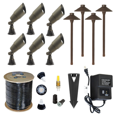 Complete landscape spotlight and path lighting kit. Includes 6 high quality solid-brass spotlights and 4 path lights with easy-install stakes - ideal for home accent, lighting tree & bushes, walkways, garden & flower beds, & other landscape features.