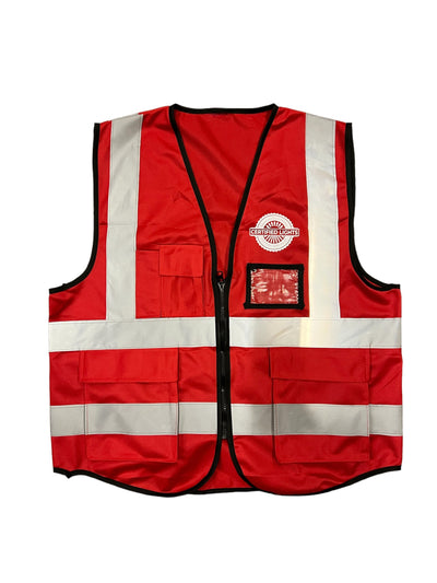 This professional safety vest features a bold red color for high visibility and a front logo that reads "Certified Lights, Professionally Trained Lighting Specialist". With an XL size and 3 pockets, this vest offers functionality and customization options for your team. The unlabeled back allows for personalized branding or contact information. Stay safe and stand out with this high-quality safety vest.